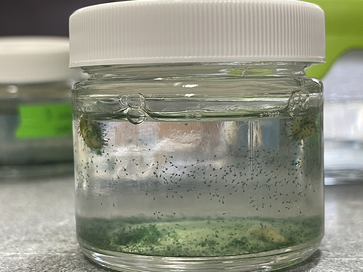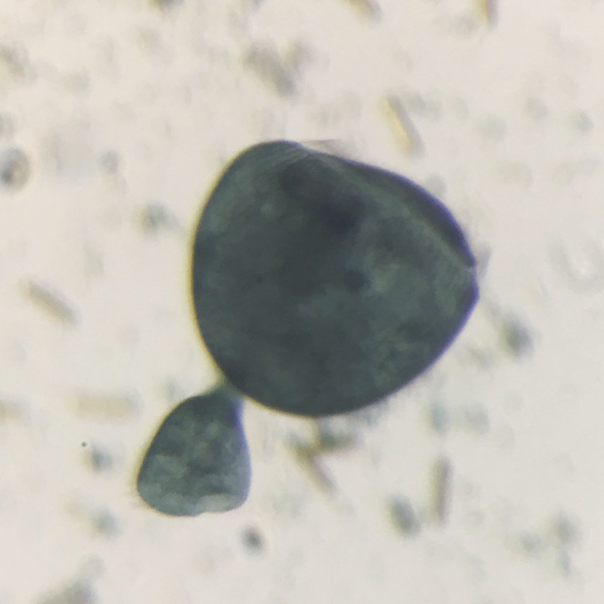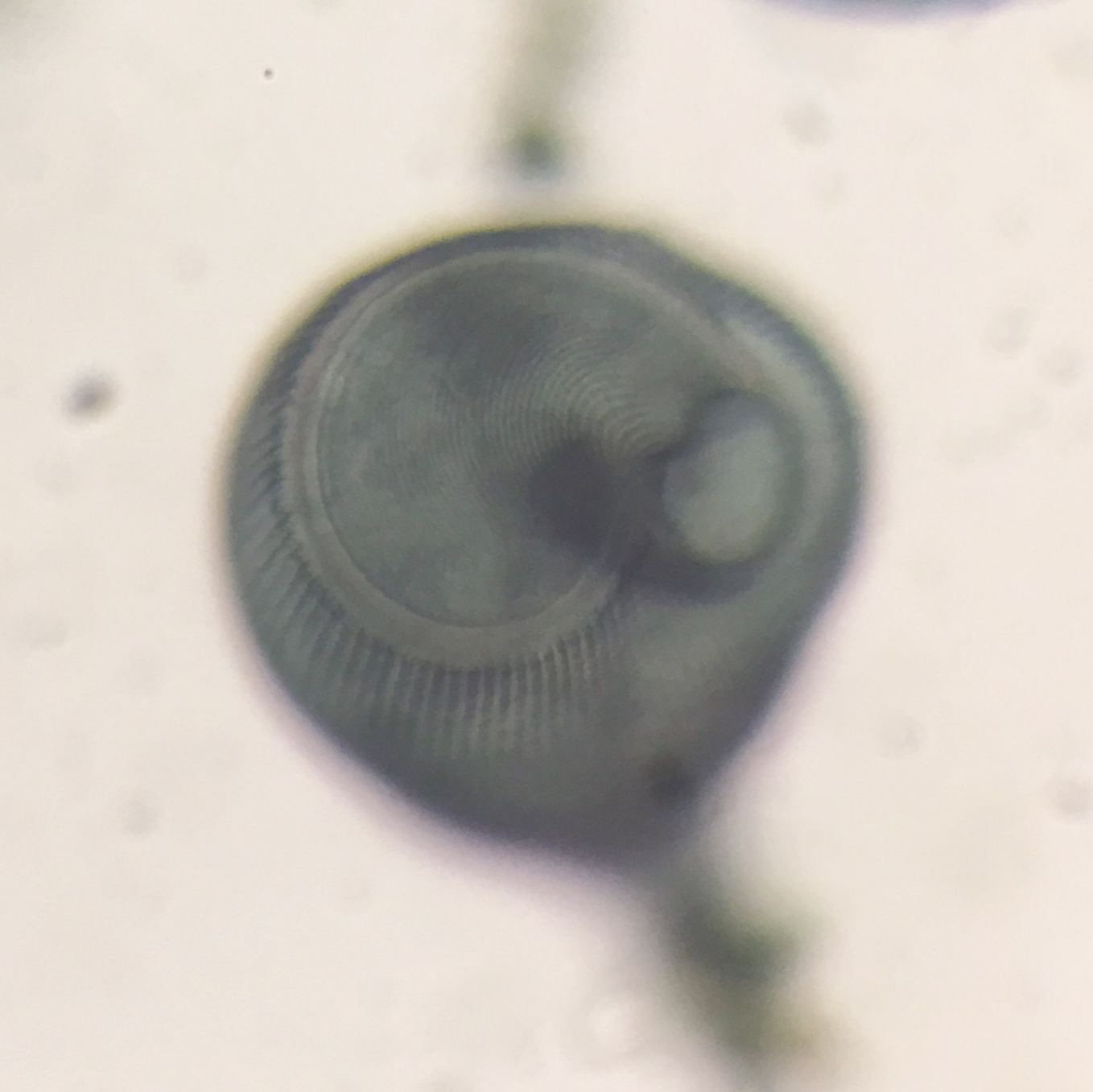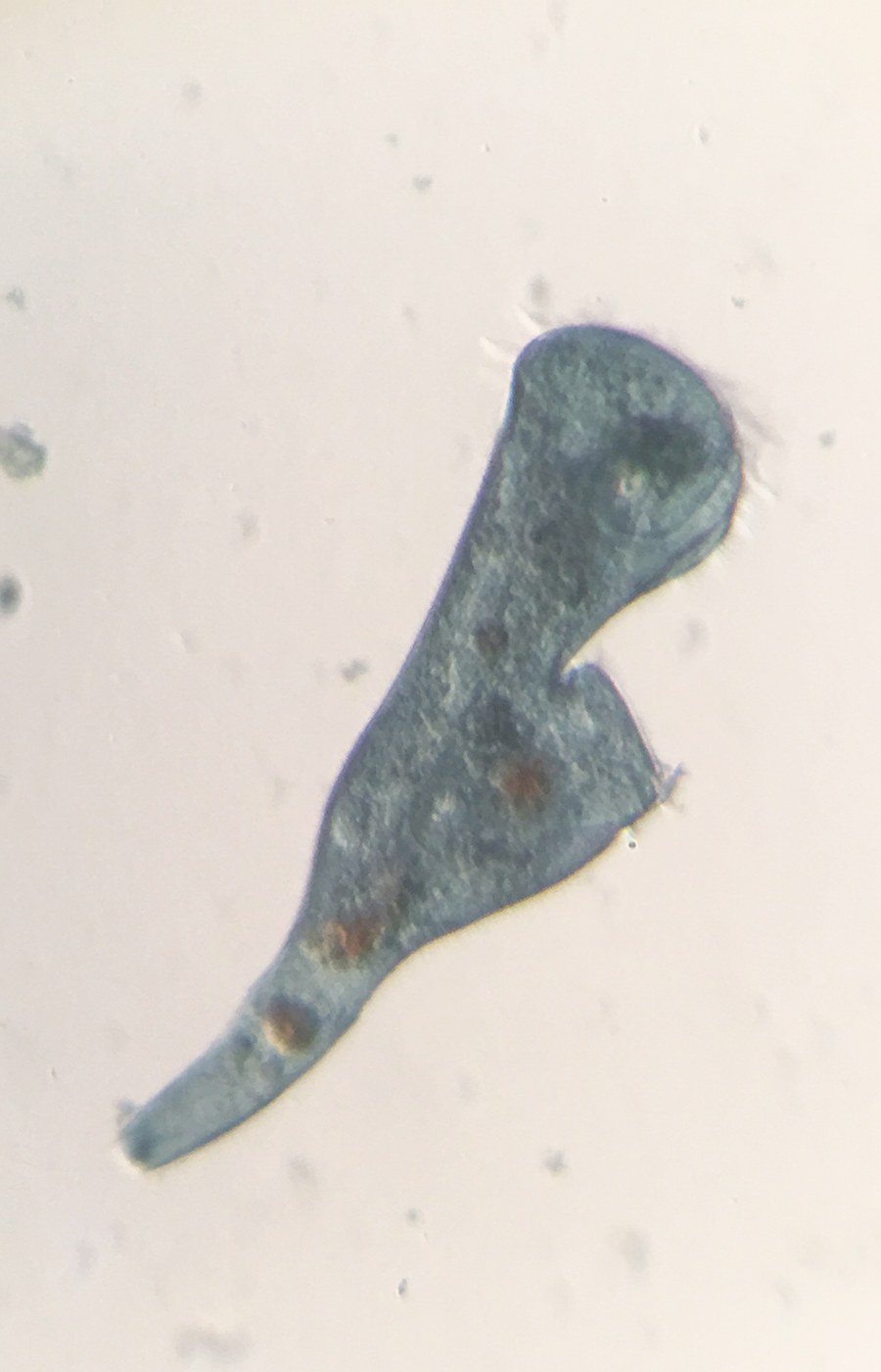 Stentor is a genus of (often) large trumpet shaped ciliates. Stentor coeruleus is the most well-known species, with its striking blue-green pigmentation and a cell body that can be ~1mm in length and a thin tail that stretches much longer than that.
